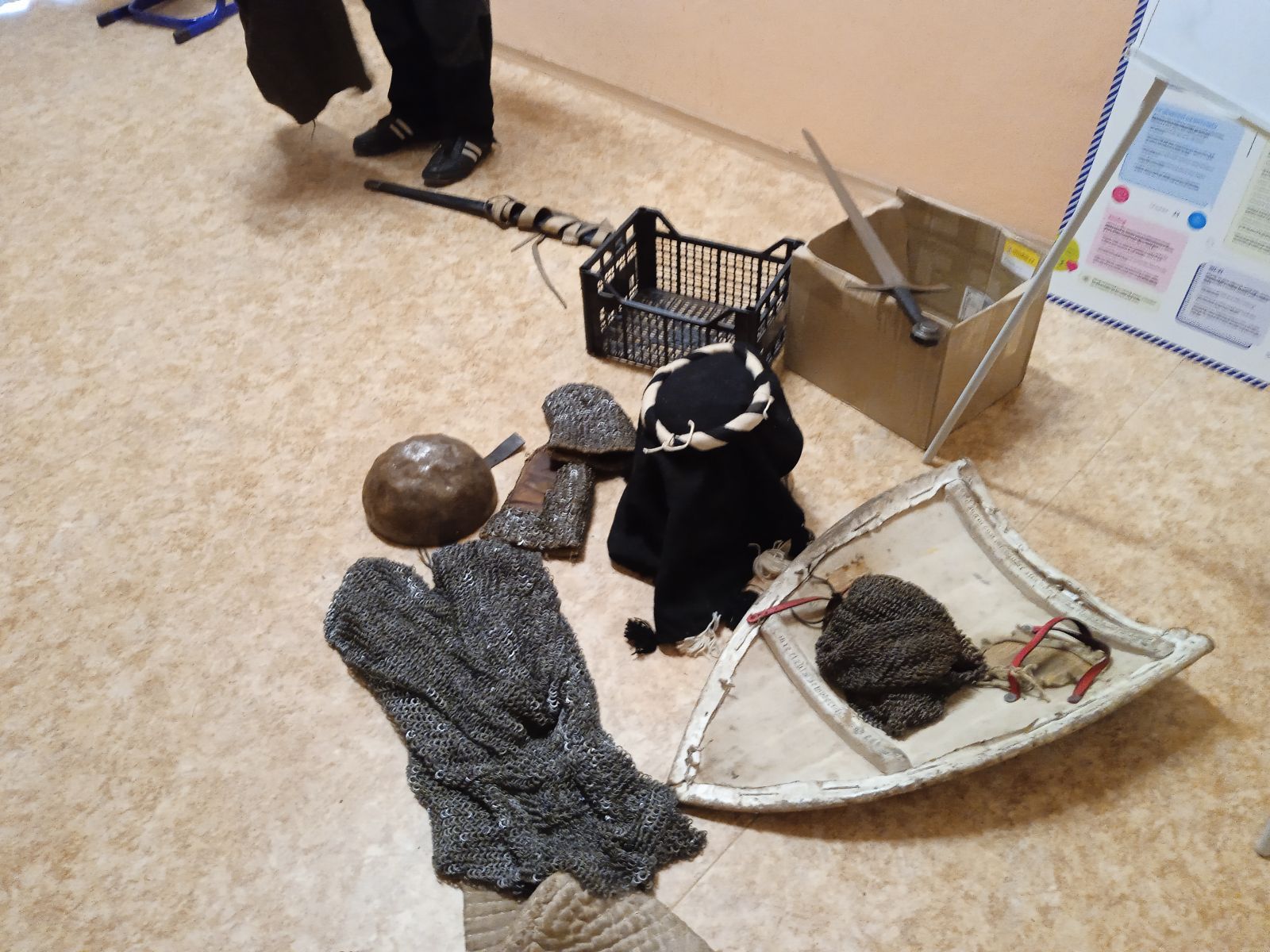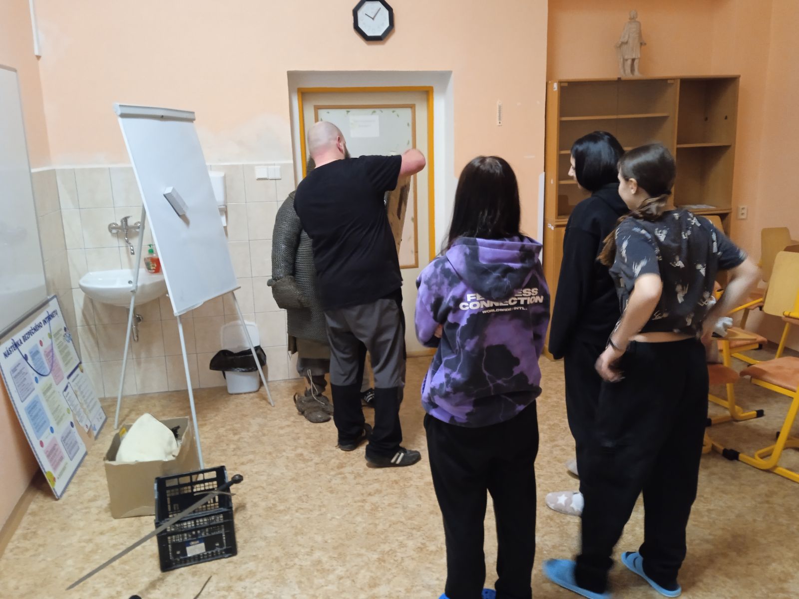 Zpestřením výuky dějepisu byla ukázka výzbroje rytíře a její praktické využití.